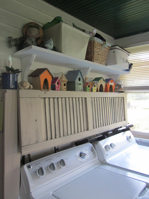 I don't have a very large laundry area but I am fortunate enough to have a space dedicated to the task. A few years ago I used an old shutter and build a very simple shelf to stand up behind the washer and dryer for holding all the detergents and such needed to keep my laundry in tip-top shape. Above this space was a wire rack shelf for things that needed mending, the occasional toy in time-out, and some swimsuits. It was just not working.